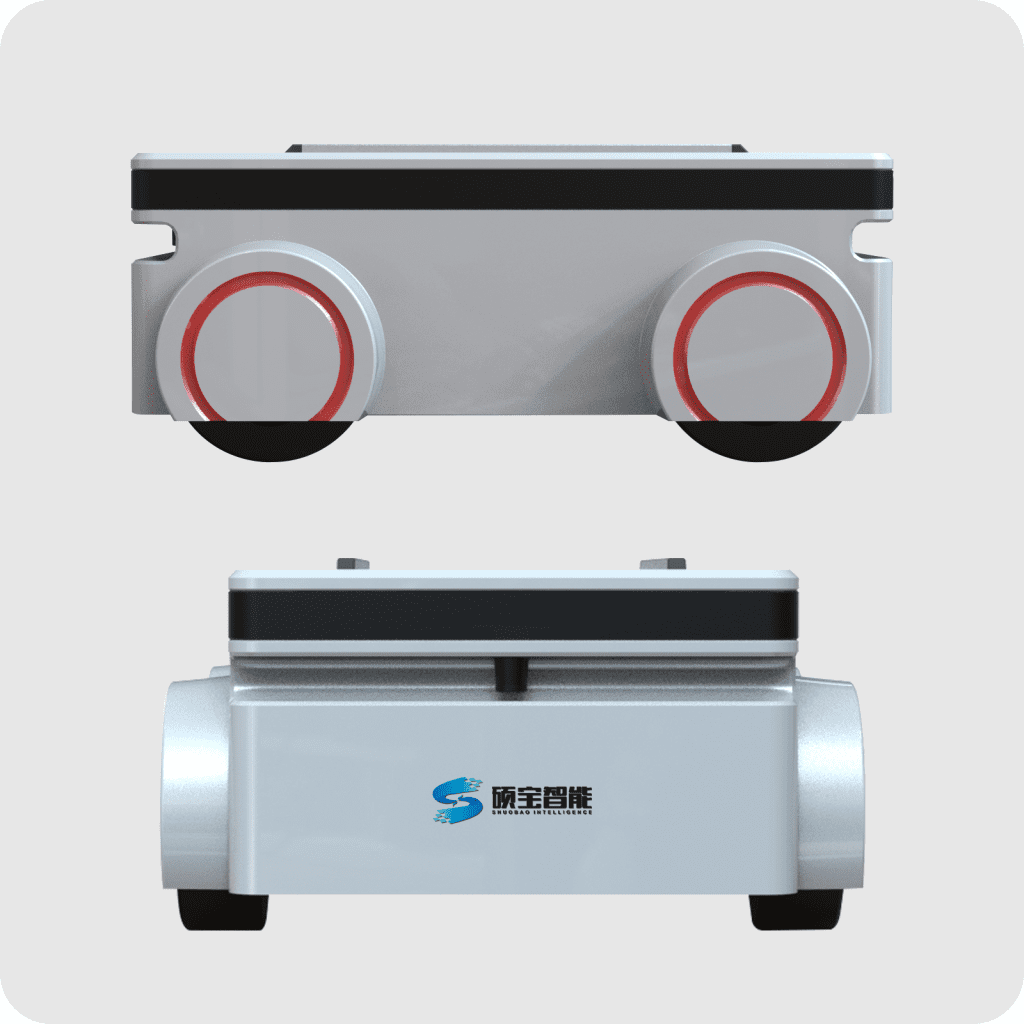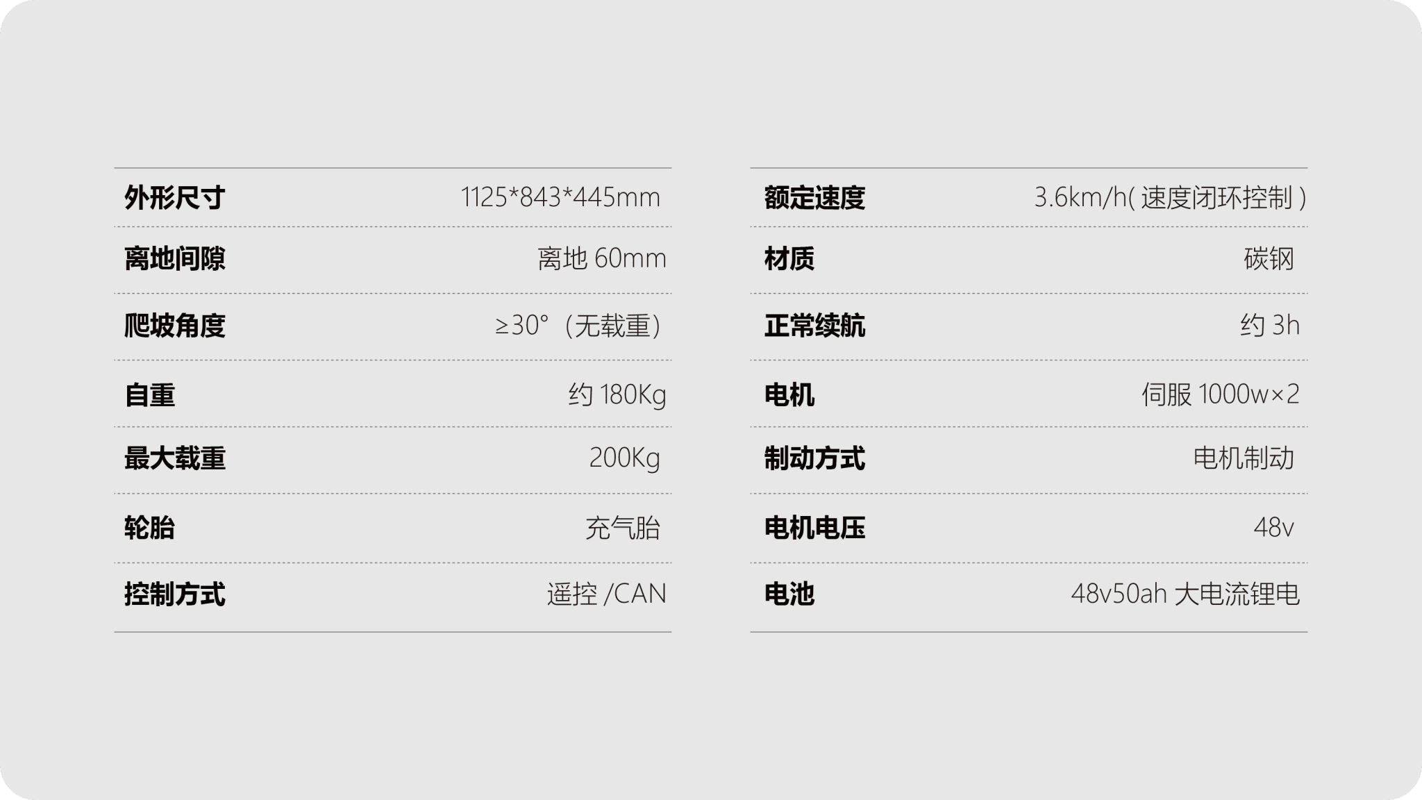 The industrial transport chassis features a carbon steel construction with a 200kg payload. It is equipped with dual 1000W servo motors and a 48V 50Ah lithium battery, providing a 3-hour runtime. The vehicle supports remote/CAN bus control, offers 60mm ground clearance, and can climb 30° slopes for complex terrain operation. It is designed for high-intensity applications in warehouses and workshops.