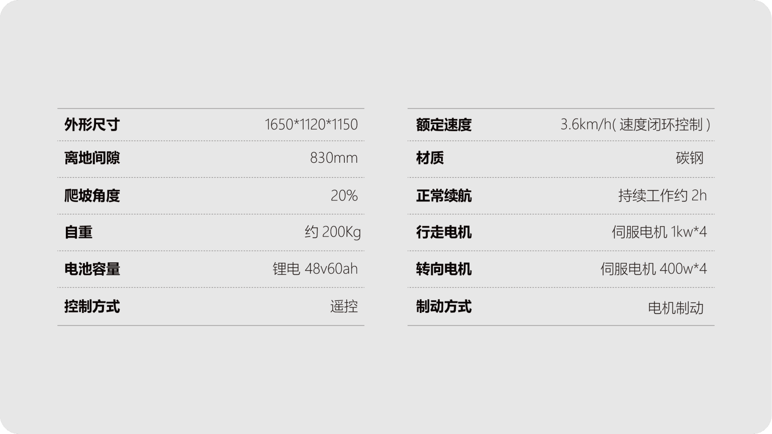 - Four wheel drive precise positioning: four-wheel independent servo motor (1kW × 4), 3.6km/h floating speed regulation, millimeter level steering between narrow ridges.