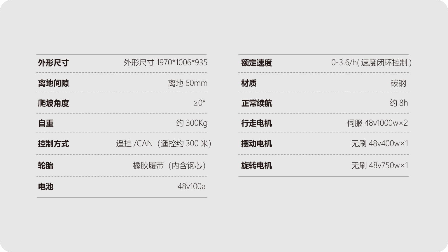 • 4小时长效续航:48V100A大容量电池,连续作业4小时,配合60mm 离地间隙,轻松应对斜坡、坑洼等复杂地形。