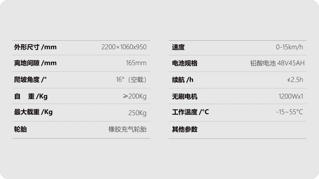 关键参数:尺寸 2200×1060×950mm,载重 100kg,离地间隙 200mm,攀爬能力 30°坡, 续航时间超过 6 小时,可在 -15~55°C 环境稳定运行。