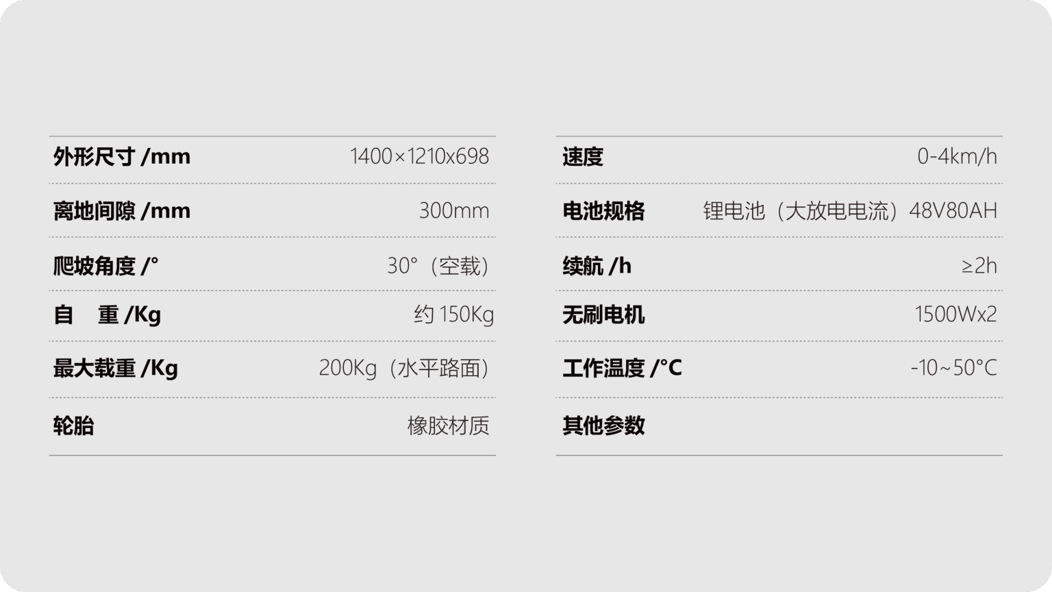 - Dual motor strong output: Dual 1500W brushless motors work together to drive, with abundant torque, easily carrying 200kg horizontal loads, ensuring efficient execution of heavy-duty tasks.