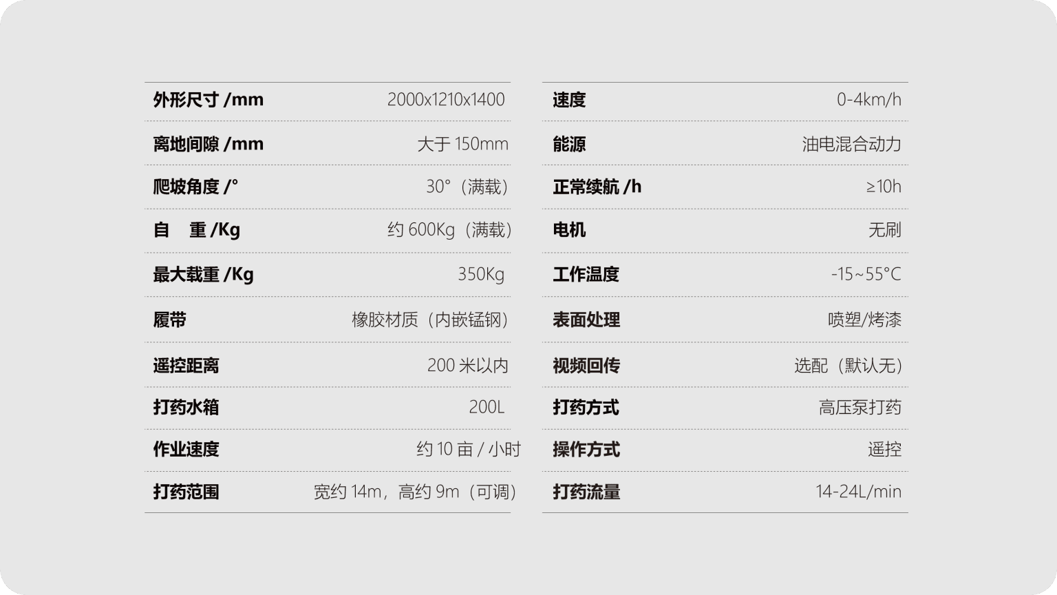 Track structure, suitable for the vast majority of road sections; High pressure spraying and atomization, uniform spraying, with a working radius of up to seven meters and a maximum coverage width of 14 meters; Remote control operation, high work efficiency (equivalent to 10 manual workers); Maximum capacity of 200kg of medicine, continuous operation; Long battery life and wide spraying range.